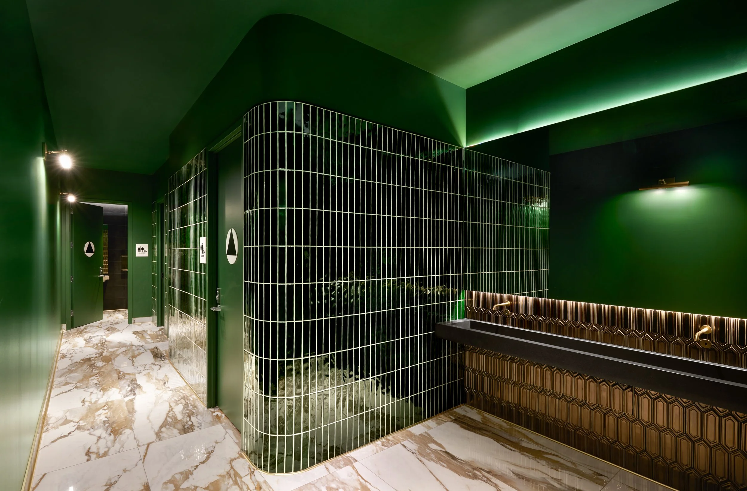 The scope included the fabrication and installation of ADA-compliant signage, including exit signage, exit route markers, gender-neutral restroom identifiers, maximum occupancy signage, and fire extinguisher blade signs. In parallel, JP Digital supported the restaurant build-out across multiple dining areas through the installation of custom wallcoverings, decorative finishes, and precision-applied wood veneer elements that enhanced the layered interior design.